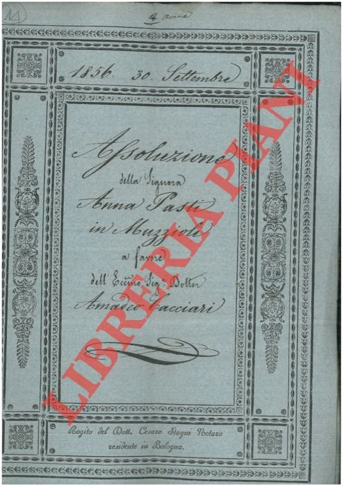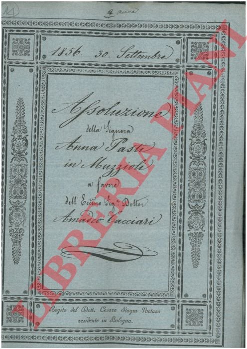 Bologna, 1856, settembre 30, rogito originale di 4 pp. in cartella con bella cornice xilografica, timbro a secco, firma del notaio Cesare Stagni di Bologna