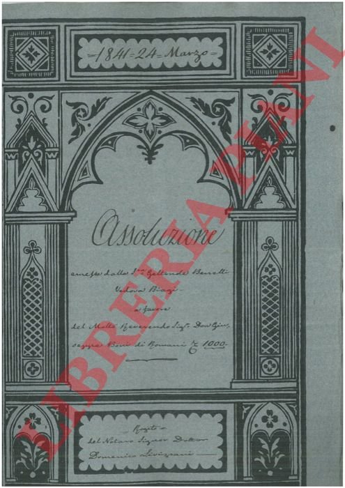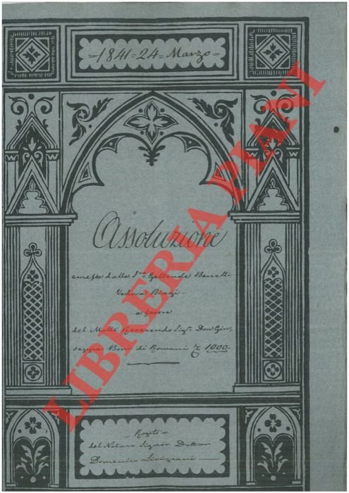 Bologna, 1841, marzo 24, rogito originale di 16 pp. in cartella con bella cornice xilografica, timbro a secco, firma del notaio Domenico Livizzani di Bologna