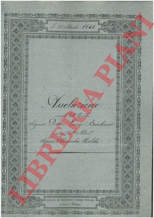 Bologna, 1841, settmbre 25, rogito originale di 4 pp. in cartella con bella cornice xilografica, timbro a secco, firma del notaio Francesco Ferridi Bologna