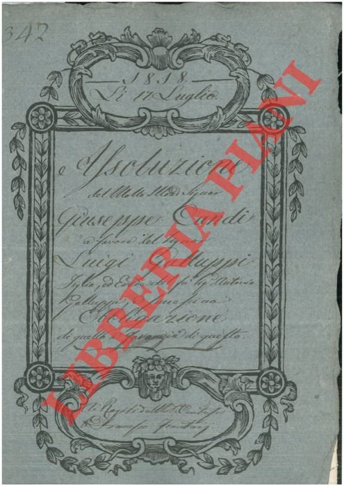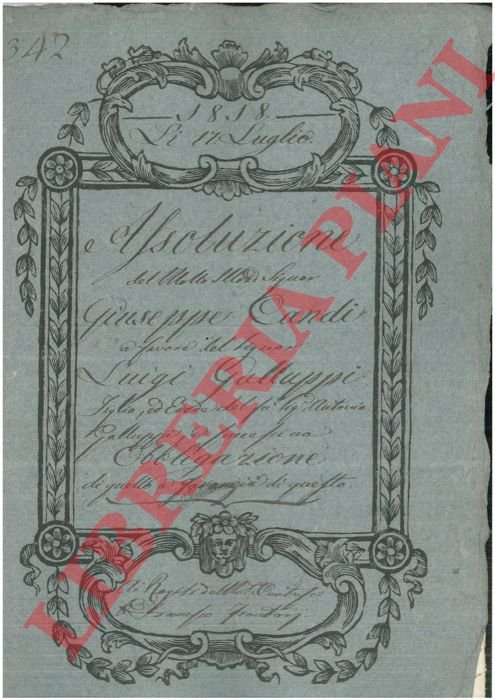 Bologna, 1867, febbraio 23, rogito originale di 4 pp. in cartella con bella cornice xilografica, timbro a secco, firma del notaio Francesco Frantoni di Cento