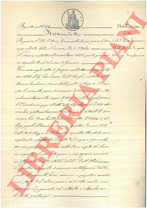 Bologna, 1866, gennaio 3, rogito originale di 4 pp. , timbro a secco, firma del notaio Luigi Bandera di Bologna