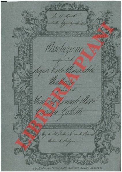 Bologna, 1864, agosto 26, rogito originale di 8 pp. in cartella con bella cornice xilografica, timbro a secco, firma del notaio Riccardo Baravelli di Bologna