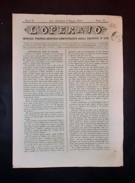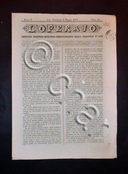 Asti - Giornale L'Operajo (operaio) - N° 31 - Anno II - 1 Maggio 1853