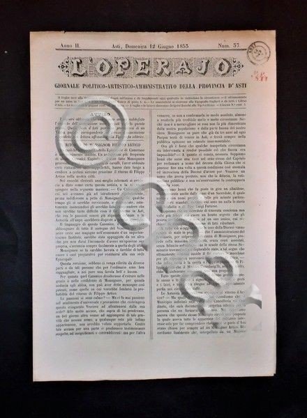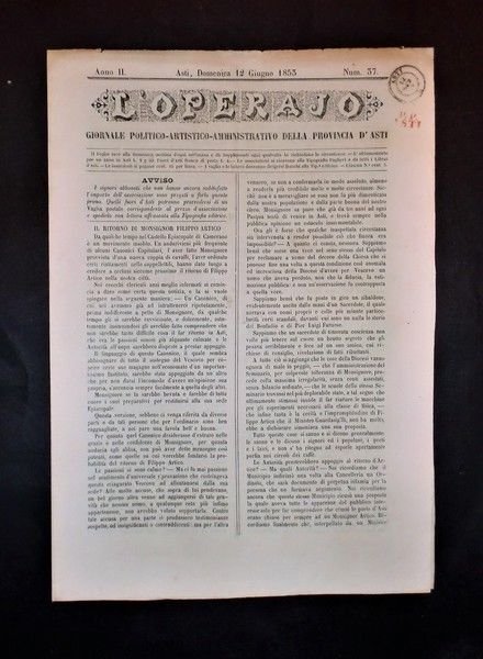 Asti - Giornale L'Operajo (operaio) - N° 37 - Anno II - 12 Giugno 1853