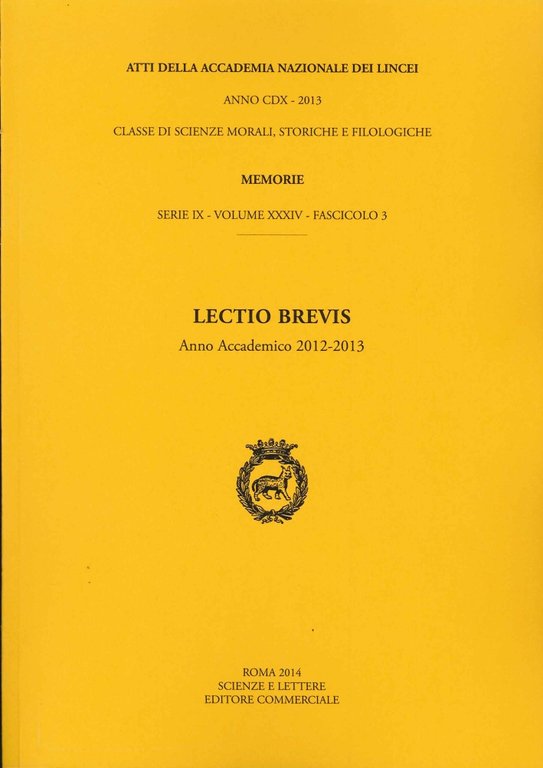 Atti della Accademia Nazionale dei Lincei. Classe di Scienze Morali, Storiche e Filologiche. Volume 34. Fasc. 3. Lectio Brevis. Anno Accademico 2012-2013. Anno CDX - 2013, Roma, Accademia Nazionale dei Lincei, 2014