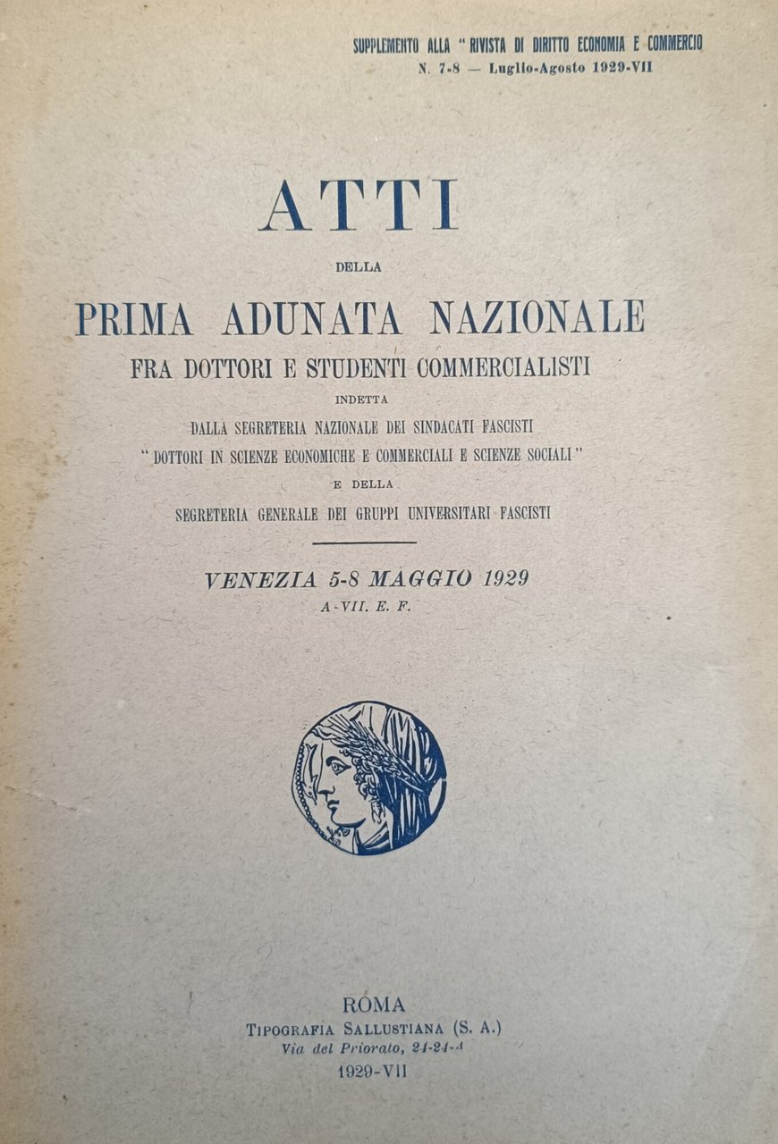 ATTI DELLA PRIMA ADUNATA NAZIONALE FRA DOTTORI E STUDENTI COMMERCIALISTI INDETTA DALLA SEGRETERIA NAZIONALE DEI SINDACATI FASCISTI "DOTTORI IN SCIENZE ECONOMICHE E COMMERCIALI E SCIENZE SOCIALI" E DELLA SEGRETERIA GENERALE DEI GRUPPI UNIVERSITARI FASCISTI