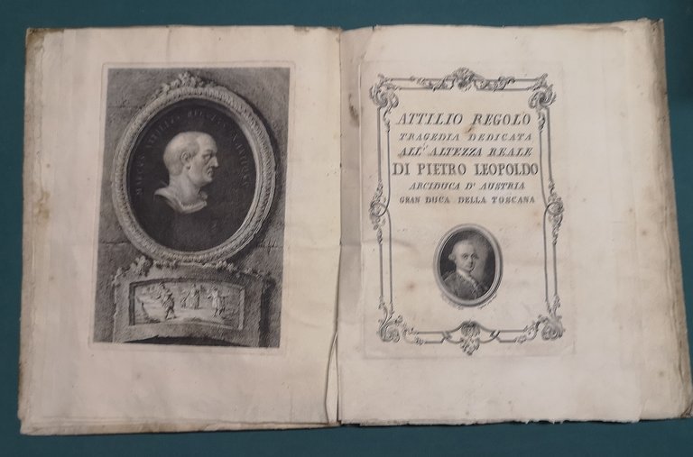 >in-4, pp. (2), 84, leg. epoca cart. rustico. Antiporta con grande ritr. di Attilio Regolo e vignetta, titolo racchiuso in elegante bordura e ritratto di Pietro Leopoldo in medaglione inc. da Cagnoni, ritratto del Granduca Pietro Leopoldo, cui l'opera è dedicata, una testatina con le armi granducali ed un finaletti inc. dall'astigiano Pittarellli. Prima edizione di questa tragedia in cinque atti in prosa, della quale fu detto che ''senza effetti amorosi traeva lacrime''; anch'essa è ambientata nell'antica Roma. Esempl. a pieni margini, con barbe. Salvioli 430 (ediz. poster.). DBIt., XLII, pp. 126-130.