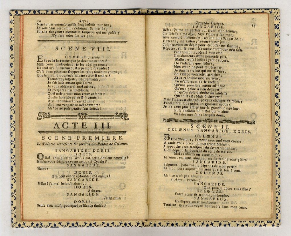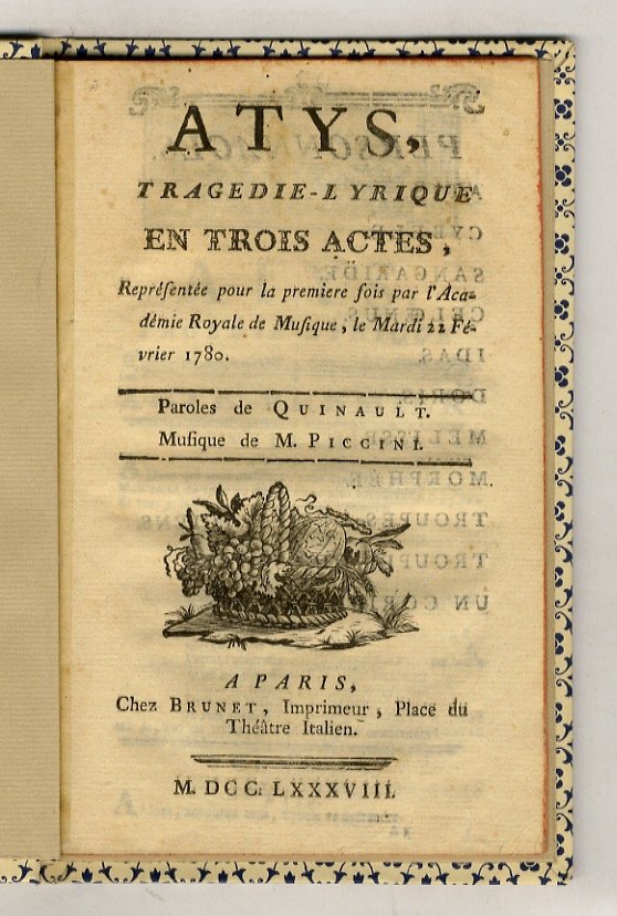 Paris, chez Brunet, Imprimeur, Place du Théatre Italien, 1788, in-8, cartone decorato moderno, tagli rossi, pp. 22. Bella vignetta al frontespizio (canestro di frutta) e testata allegorica incise in xilografia. Il libretto di Marmontel è basato su quello di Philippe Quinault per l'omonima opera di J.-B. Lully del 1676 (a sua volta ispirato ai "Fasti" di Ovidio). La 1a rappresentazione è del febbraio 1780 alla Salle du Palais-Royal: la versione originale (la stessa di questa edizione) prevedeva un finale drammatico, col suicidio di Atys, ma dal 1783 ne fu elaborata anche una seconda versione che prevedeva un "lieto fine". Ottime condizioni.