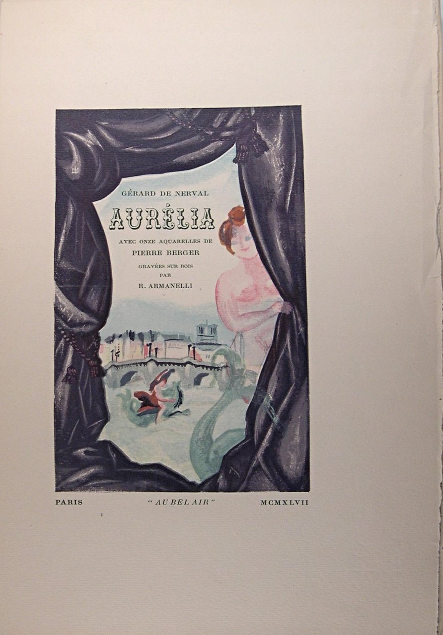 Au bel air, Paris, 1947. In/4 en feuilles, couverture rempliée sous chemise demi-toile et étui cartonnés verts, illustrations de Pierre Berger, 143 pages. Exemplaire numéroté sur vergé crème Vidalon. Tirage 350 exemplaires. Monod 8633.