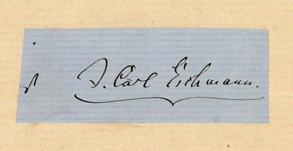 1 S. Kleines Visitkartenformat. Der Sohn eines Militärmusik-Kapellmeisters erhielt anfänglich Klavierunterricht bei Alexander Müller in Zürich und wurde 1845 am Leipziger Konservatorium Schüler von Felix Mendelssohn Bartholdy. "Seit 1847 war er in Zürich, 1850-59 in Winterthur Lehrer für Klavier, Harmonie und Komposition. Anschließend ging er nach Schaffhausen, wo er sich als Klavier- und Gesanglehrer betätigte und seit 1862 den Männerchor Schaffhausen leitete. 1866 ließ sich Eschmann in Zürich nieder und wirkte dort bis zu seinem Tod als Klavierlehrer. Er komponierte zahlreiche Chor- und Klavierwerke und veröffentlichte 1879 einen 'Wegweiser durch die Klavier-Literatur'" (DBE).