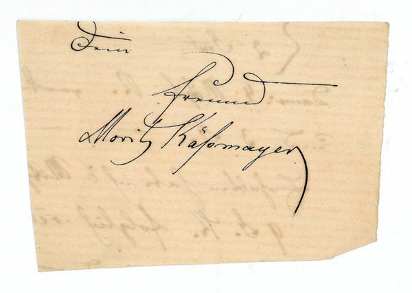 1 S. Ca. 55:82 mm. Dein | Freund | Moritz Käßmayer. - Moritz Käßmayer war Schüler von Simon Sechter, Gottfried von Preyer, Georg Hellmesberger und Joseph Böhm, wurde 1856 Mitglied der Wiener Philharmoniker (1. Violine) und später Dirigent der Ballettmusik an der Hofoper sowie ab 1873 Mitglied der Hofmusikkapelle. - Unregelmäßig beschnitten.