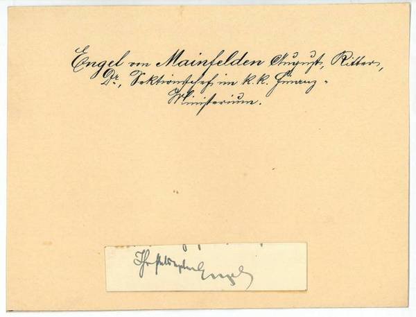 Ca. 20 x 75 mm. Auf Trägerkarton. Nach dem Studium der Rechts- und Staatswissenschaften in Wien trat Engel von Mainfelden 1878 bei der Finanzprokuratur in den Staatsdienst ein. 1883 wechselte er in das Finanzministerium über, wo er maßgeblich am Aufbau einer eigenen Budgetsektion beteiligt war, deren Leitung er 1905 übernahm. Er setzte die Umstellung der staatlichen Wirtschaftsführung auf einen budgetären Wirtschaftsplan durch und erreichte damit den Ausgleich des Staatshaushaltes. 1913 mit der Vertretung des Finanzministers beauftragt und 1915 zum Finanzminister ernannt, sorgte er zu Beginn des Ersten Weltkriegs dafür, dass der österr. Staatskredit zunächst erhalten blieb. Differenzen mit der Militärverwaltung und mit parlamentarischen Kreisen veranlaßten ihn jedoch bald zum Rücktritt.