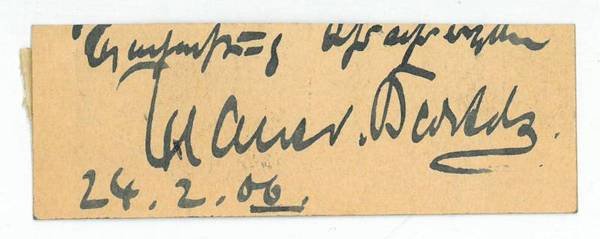 Ca. 30 x 90 mm. Ausschnitt einer Postkarte mit Unterschrift und Datum. - Hans von Bartels, Sohn eines kaiserlich russischen Kollegienassessors, erhielt seinen Unterricht bei dem Marinemaler Rudolf Hardorff in Hamburg, bildete sich in Düsseldorf weiter fort und unternahm Studienreisen durch Norddeutschland und Italien. "1885 siedelte er nach München über, bereiste alljährlich die Küsten Hollands, Englands und Frankreichs, wo er seine bevorzugten Sujets, einsame Strände und bewegte See, fand" (DBE); 1891 wurde er zum königlich bayerischen Professor ernannt.
