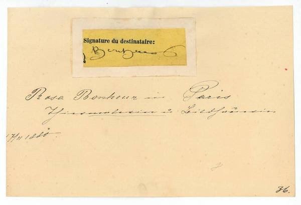 Ausschnitt 79 x 29 mm. Gelbes Druckpapier, auf Trägerpapier montiert. Aus einem Formular ("Signature du destinataire"), nur die Unterschrift ("Bonheur"). Datierung laut Vermerk am Trägerpapier, verso Akquisitionsnotiz des Sammlers in roter Tinte (20. Nov. 1880 erh."). - Die wohl bekannteste Malerin des 19. Jahrhunderts ist für ihre realistischen Tierdarstellungen berühmt.