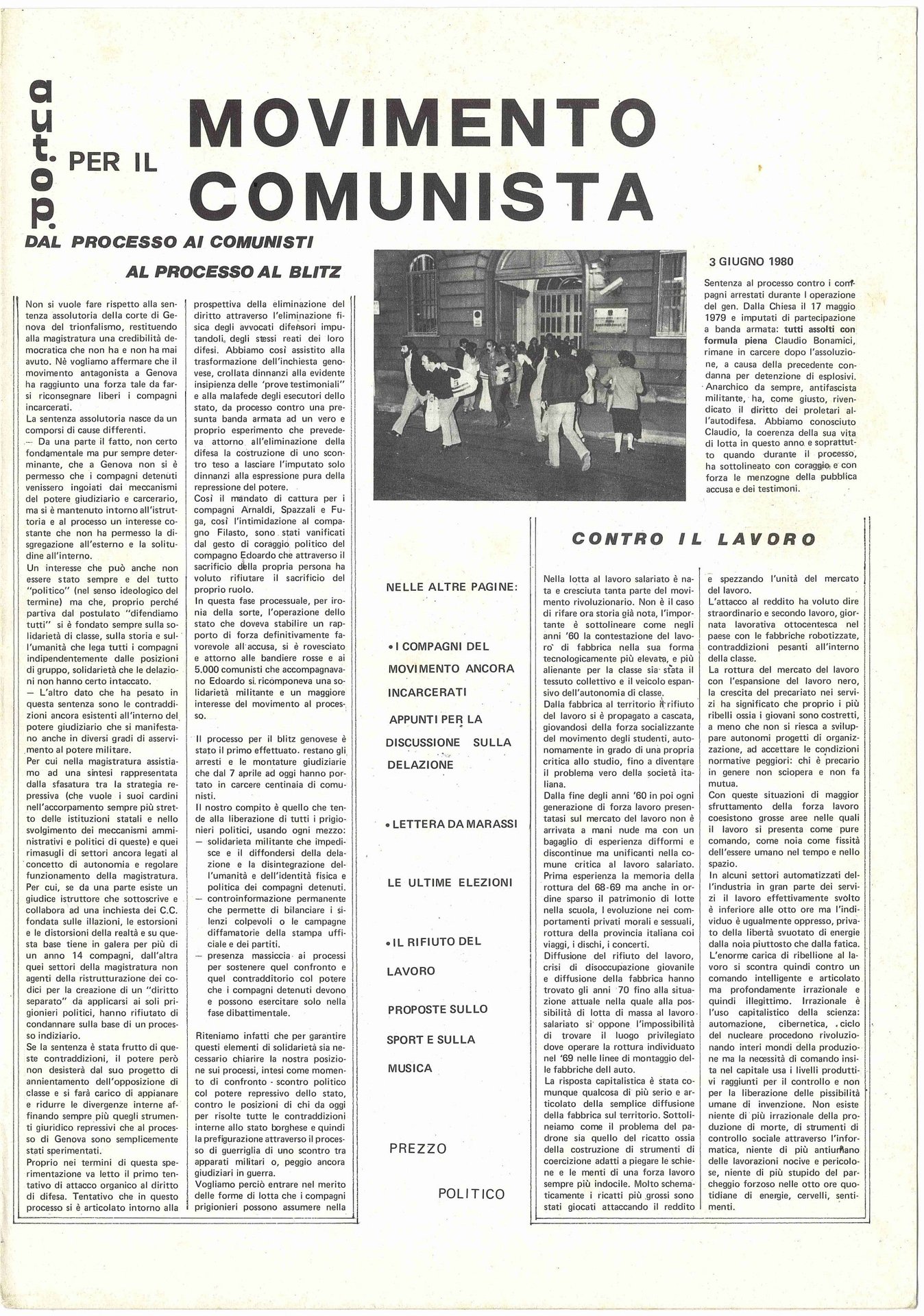 Foglio giornale stampato in b/n, direttore responsabile Marcello Baraghini, supplemento a Stampa Alternativa, in ottimo stato. Giornale redatto in gran parte dai compagni del Comitato dell'Autonomia Operaia di Sampierdarena – C.A.S.- dopo la conclusione (3 giugno 1980) del processo agli arrestati del "blitz" di Dalla Chiesa (17 maggio 1979) ( Associazione per un archivio dei movimenti, Fondo Giorgio Moroni, Faldone VIII, fascicolo II, n.9) http://www.archiviomovimenti.org/fondo.asp?ID=54