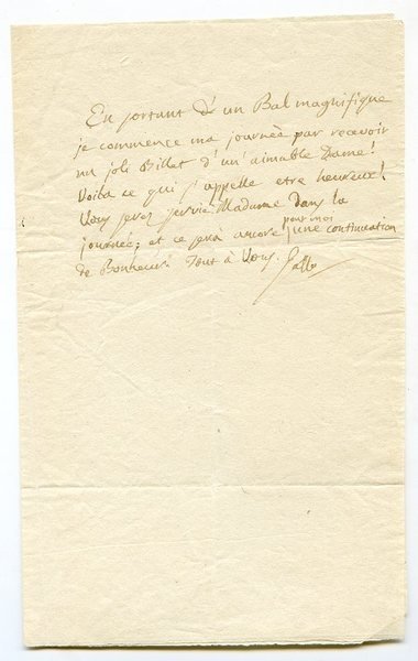 Large 8vo. ½ p. on bifolium. In French. Charming letter to an unnamed woman, thanking her for a "kind card" that he had received in the morning upon his return from a "magnificent ball": "En sortant d'un bal magnifique je commence ma journée par recevoir un joli billet d'un' aimable Dame! Voila ce qui j'appelle étre heureux! Vous serez servie Madame dans la journée ; et ce sera encore pour moi une continuation de Bonheur [.]". - Slightly creased.