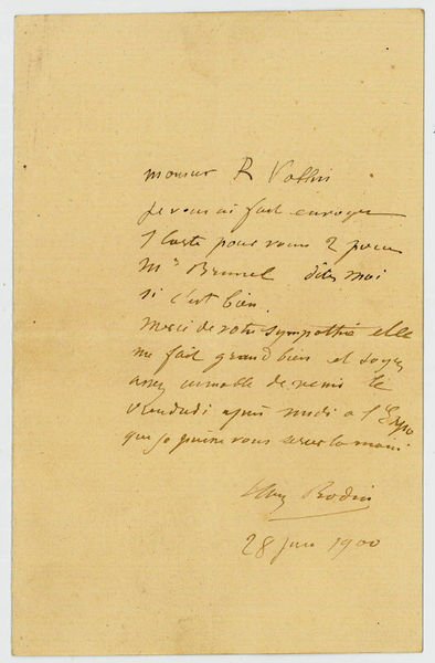 1 p. on bifolium. With autogr. envelope. To Monsieur Vollin (?), sending three tickets for an exhibition and hoping to see him there: "Je vous ai fait envoyer 1 carte pour vous, 2 pour Mr Brunel. Dites-moi si c'est bien. Merci de votre sympathie, elle me fait grand bien, et soyez assez aimable de venir le vendredi après midi à l'Expo que je puisse vous serrer la main [.]".