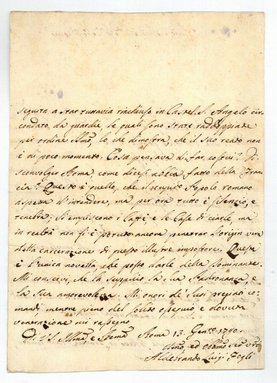 4to. 2 pp. on bifolium. Highly interesting letter offering a contemporary view on the Italian occultist and impostor Giuseppe Balsamo (1743-95), better known as Count Alessandro di Cagliostro, in the immediate aftermath of his arrest in Rome on 27 December 1789. After apologizing for not writing earlier, as he had to respond to "heaps of annoying Christmas wishes" that occupy secretaries such as himself, "nihil agendo", Fogli relates what he knows about Cagliostro's imprisonment in Rome and the reaction of the populace: "Mr. Cagliostro, who caused so much commotion in France, nevertheless continues to be imprisoned in Castel Sant'Angelo surrounded by guards, who have been doubled by order of His Holiness, which demonstrates that his crime is no mere 'bagatelle'. What did he think he was doing? Will Rome be as agitated as France is said to have been? That is what the eager Roman people are expecting; the cafés and houses are filled with chatter, but in reality it has not yet been possible to understand the true cause of the imprisonment of this illustrious impostor" (transl.). - Giuseppe Balsamo was born into a poor Palermitan family that provided him with a good education. Around 1760 he started a novitiate in the convent of the Fatebenefratelli in Caltragirone. Serving as the assistant to the monastery's pharmacist, Balsamo received basic medical and pharmacological training but was eventually expelled from the convent for misconduct. In 1764 he defrauded a goldsmith posing as an occultist and fled to Malta. There, he first introduced himself as Count Cagliostro before the Grand Master of the Sovereign Military Order of Malta, who employed him as a pharmacist. According to Cagliostro's claims, he subsequently travelled to Greece, Egypt, and Persia and was initiated to ancient masonic rites and alchemical knowledge during his journey. In 1768, he worked briefly as secretary to Cardinal Orsini in Rome, soon moving on with his wife and the forger Agliato to London, Courland, Poland, and Germany, among other destinations. After a failed attempt to win the patronage of Catherine the Great, who had received warning, they abruptly left St Petersburg for Strasbourg in 1780. France proved a more fertile ground for Cagliostro's schemes. His growing reputation as an occultist, freemason and healer earned him an invitation to Paris by Cardinal Rohan in 1785, where he received a warm welcome at the court. Soon after his arrival, however, Cagliostro was prosecuted in the infamous Affair of the Diamond Necklace, which involved Marie Antoinette and Cardinal Rohan. Cagliostro was eventually acquitted under the condition of permanently leaving France. During a 1789 visit to Rome, Cagliostro was arrested by the Inquisition on suspicion of trying to start a masonic lodge. Initially condemned to death, his sentence was reduced to life in prison at Forte di San Leo, where he died in 1795. - According to a later note, the letter was addressed to Archbishop Alessandro Alessandretti (1738-1815). - Traces of folds. With a minor tear and collector's notes in pencil.