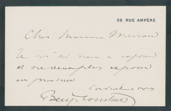 Oblong 12mo (139 x 91 mm). 4 lines. Interesting letter to the academic painter and art critic Charles-Olivier Merson, asserting that he as "nothing to exhibit" and that he doesn't want to participate in exhibitions in the province anymore: "Je n'a rien a exposer et ne veux plus exposer en province". - Merson was the curator for paintings at the Exposition de Bordeaux. - On mourning paper with printed letterhead. Well preserved.