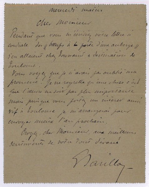 12mo. 1p. With autograph address. To the academic painter and art critic Charles-Olivier Merson, informing him that his painting "Boeufs à la porte d'une auberge" has been sent to Toulouse and is therefore not available for an exhibition, probably the Exposition de Bordeaux: "Pendant que vous m'écriviez votre lettre si cordiale des 'bœufs à la porte d'une auberge' j'en allaient chez Toussaint à destination de Toulouse. Vous voyez que je n'avais pas oublié ma promesse. Je ne regrette qu'une chose c'est que l'œuvre ne soit pas plus importante mais puisque vous portez un intérêt aussi vif à Toulouse je m'arrangerai pour envoyer mieux l'an prochain". - Well preserved.