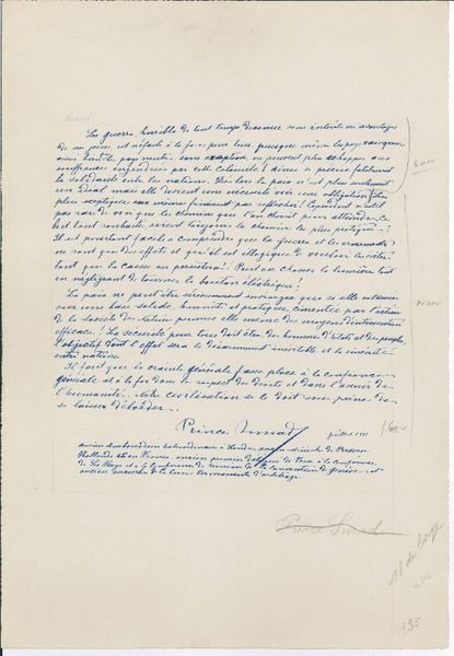 Folio. 1 page. On uncut wove paper, bearing the Schoellers-Parole blind embossed seal, margins uncut. The original autograph contribution of Samad Khan to the Committee of the World League for Peace (Ligue Mondiale pour la Paix), a remarkable organization formed in 1925 with close ties to the League of Nations. The Committee itself was composed of such notaries as Queen Elizabeth of Belgium, King Carol II of Romania, John D Rockefeller, Marie Curie, and Albert Einstein, who personally gathered the present manuscripts over the course of seven years (1925-32). Among the public figures who contributed to the project were numerous dignitaries from the newly-created League of Nations' member states. "War, terrible in all times, has become vain and profitless today, and is equally disastrous for all involved, as even the counquering countries, as well as neutral countries, without exception, can no longer escape the suffering engendered by that calamity! The solidarity between nations has thus become fatally clear. Because of this, peace is no longer simply an ideal, it is becoming a necessity and an obligation. Even the most sceptical among us must finally give pause and reflect. Yet, how rarely are the means we choose to attain this much desired goal the most practical ones! Despite the fact that it is easy to understand that warfare and arms are merely effects, and that it is illogical to wish to avoid them while their causes persist! Can we extinguish an electric light without turning off the switch? Peace can only be seriously envisaged if it is also on a solid base, honest and practical, cemented by the work of the League of Nations, itself equipped with the effective means of intervention! Security for all, men of state and the people, should be the objective, the effect of which will be an inevitable disarmament and sincerity between nations. General fear must make way for a general trust and for faith in the respect of rights and in the future of humanity. Our civilisation owes this to itself, lest it be overcome. [Signed] Prince Smad, former Extraordinary Ambassador to London, former Persian Minister in Holland, and in France, former Premier Delegate of Persia to the Conference in The Hague and the Conference on the Revision of the Geneva Convention, and Permanent Court of Arbitration". Prince Samad was Ambassador to London, Holland, France. He personally owned the Embassy in Paris, which he made his home. Briefly Prime Minister of Persia in 1918. - Pax Mundi. Livre d'or de la paix. Enquete universelle de la Ligue mondiale pour la paix sous le haut patronage de son comite d'honneur avec l'approbation de la Societe des nations, du Bureau international du travail et de la Cour permanente de justice internationale. Geneve, Societe paxunis, 1932.