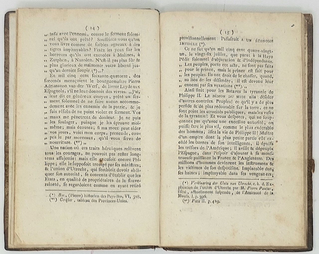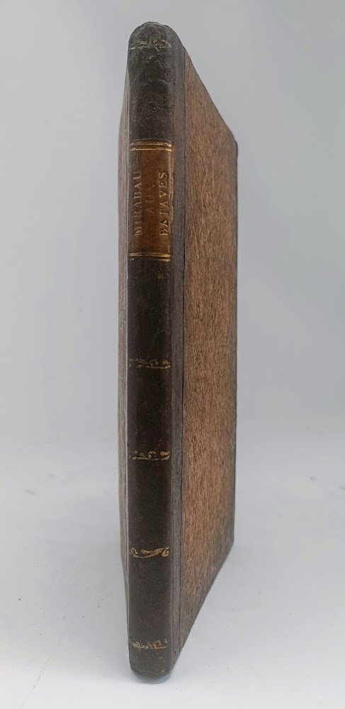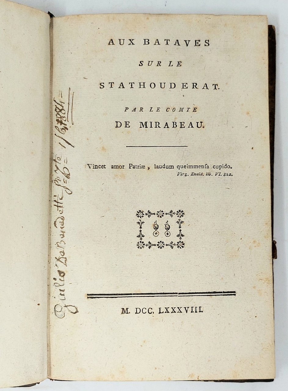 >in-8 piccolo (190x120 mm), pp. 88, legatura d'epoca in mezza pelle ed angoli, filetti e titolo in oro su tassello al dorso. Presumibile contraffazione dell'edizione originale di questo libretto, poi ripubblicato suddiviso in due parti con le note di Dumont-Pigalle e Marron. In questo pamphlet, come è noto, Mirabeau solidarizzava con i patrioti dei Paesi Bassi e con Gugliemo d'Orange contro l'invasione prussiana, incitandoli a difendere la loro aspirazione alla libertà. Famoso come anticipazione della "Declaration des droits de l'homme et du citoyen", enunciandone in XXVI punti i principi fondamentali, come: "Tous les hommes sont nés libres et egaux"; "Tous pouvoir étant émané du peuple, les différens magistrats où officiers... lui doivent comte dans tous le temps"; "Le peuple pour le bonheur de qui le gouvernement est institué, a le droit inaliénable de le réformer, de le corriger, ou de le changer"; " Toutes les élections doivent étre libres"; "Le peuple a le droit de s'assembler pour consulter sur le bien commun". Sono gli stessi principi che Mirabeau sosterrà poi nel 1789 agli Stati Generali e all'Assemblea Costituente. Esemplare con firma d'appartenenza nel margine bianco interno del frontespizio e delle prime 2 pp.: "Giulio de Benedetti, 1 giugno 1884"; ex-libris settecentesco "Ex bibliotheca De Cardenas" (il bibliofilo torinese Giuseppe de Cardenas, conte di Valeggio). Lievi fioriture sparse nei margini esterni bianchi, mancanza all'angolo superiore di p. 31.