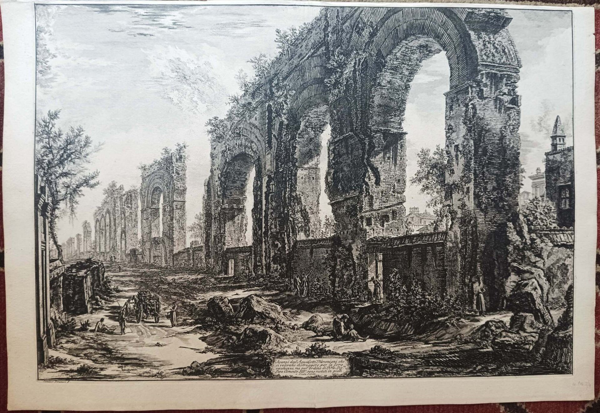 >Acquaforte originale (mm 487x705 e margini). Titolo in basso centrale, entro cartiglio: "Avanzi del'Aquedotti Neroniani che si volevano distruggere per la loro vecchiezza, ma per ordine di Nro. Sig.re Papa Clemente XIV sono restaTti in piedi. 2 Scala Santa". Firmata in basso a sinistra "Cavalier Piranesi F.". Primo stato su quattro. Tratta dalla celebre serie di 135 “Vedute di Roma disegnate ed incise da Giambattista Piranesi Architetto Veneziano” (eseguite dal 1748 al 1778), capolavoro dell'incisione di tutti i tempi. Questa celebre serie di acqueforti, iniziata intorno all'anno 1747, rappresenta l'opera più nota e richiesta della produzione artistica dell'autore. Mediante questo ambizioso progetto iconografico, ampliato nel corso degli anni, l'artista offrì al pubblico un'immagine sistematica e teatralmente suggestiva della Roma barocca con la sua urbanistica trionfale e seppe evocare con straordinaria forza espressiva il mistero e la grandiosità delle rovine dell'antica Roma. Bell'esemplare impresso su carta pesante, vergellata, filigrana "doppio cerchio e giglio", traccia di antica piega centrale.