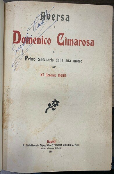 Napoli. Stabilimento Tipografico Ditta F. Gianni e Figli 1901, 8°, pp. LVI-456, con belle illustrazioni sia in bn che a colori nel testo. Legatura in mz pergamena, tit. e fregi al dorso. Conserva le copertine originali. Moltissime le riproduzioni di autografi di Cimarosa ed altri musicisti. 3 tavole cromolitografate con lo stemma della città di Aversa. Scritti di Antona Traversi, Ardigò, Barrilli, Bracco, Capuana, Croce, De Amicis, Deledda, Di Gaicomo, Fogazzaro, Molmenti, Matilde Serao e tutti i più rappresentativi personaggi italiani dell'epoca. Edizione numerata di 500 esemplari fuori commercio. Cfr. Schlitzer, n. 905.