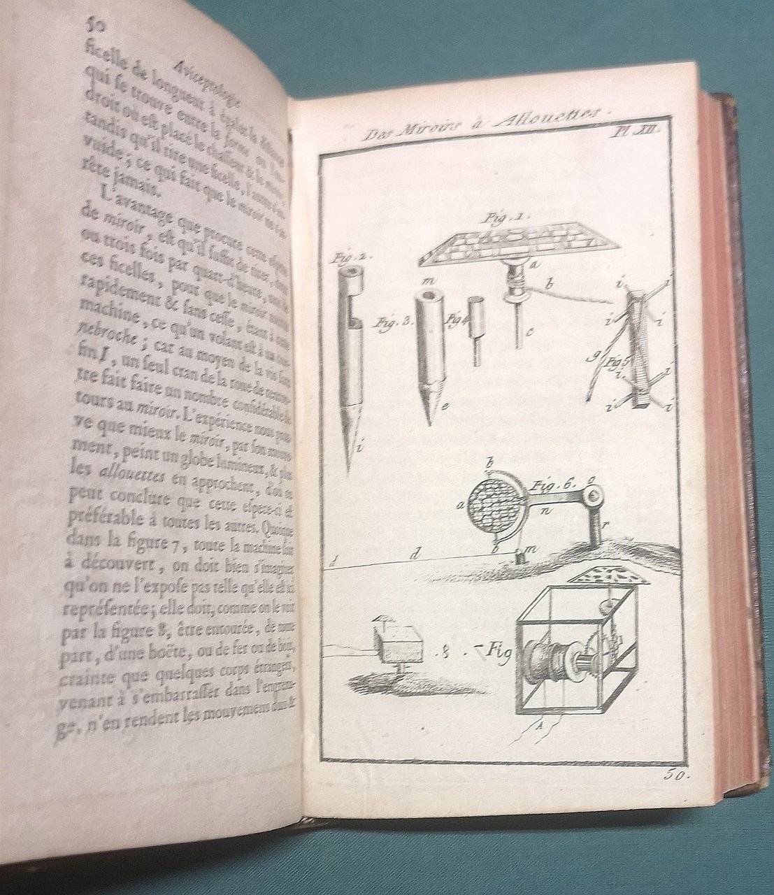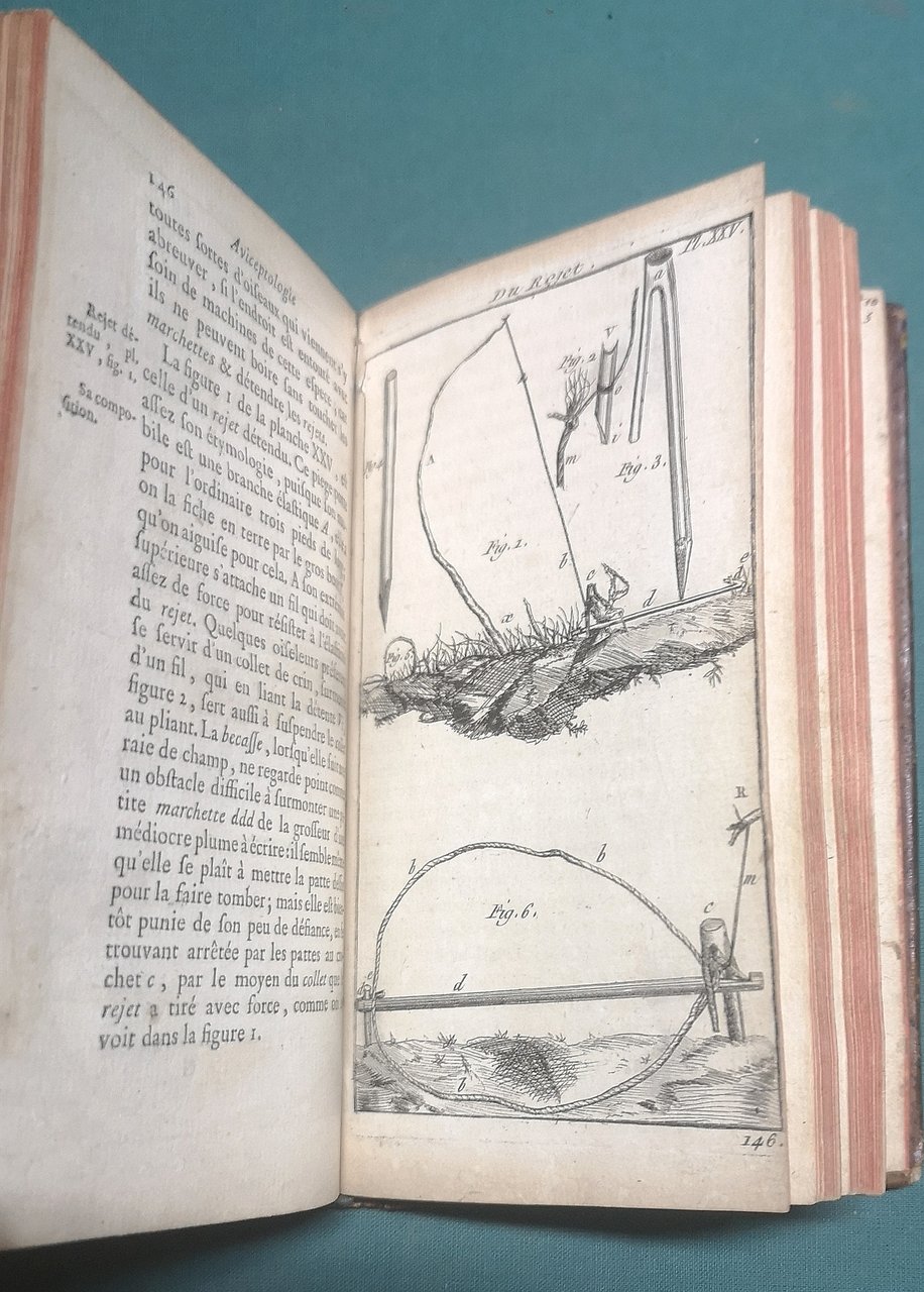 >in-12, pp. XXIV, 190, (2), XLIII, (5), bella legatura coeva p. pelle mouchetée, filetto a secco ai piatti, titolo e fregi oro al dorso. Adorno di un'antiporta figurato e 34 belle tavole incise in rame fuori testo raffiguranti i più svariati strumenti e modi per attirare, richiamare ed intrappolare i volatili. Prima edizione di raro, importante e diffuso trattato di caccia agli uccelli. Bell'esemplare. Thièbaud, Bibliogr. sur la chasse, p. 139.
