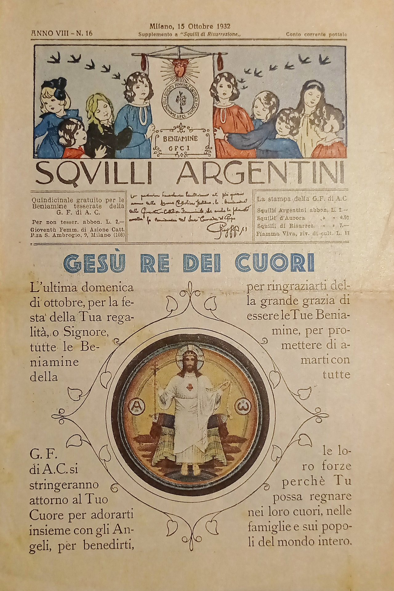 Azione Cattolica - Squilli Argentini N. 16 - 1932 Gesù Re dei Cuori