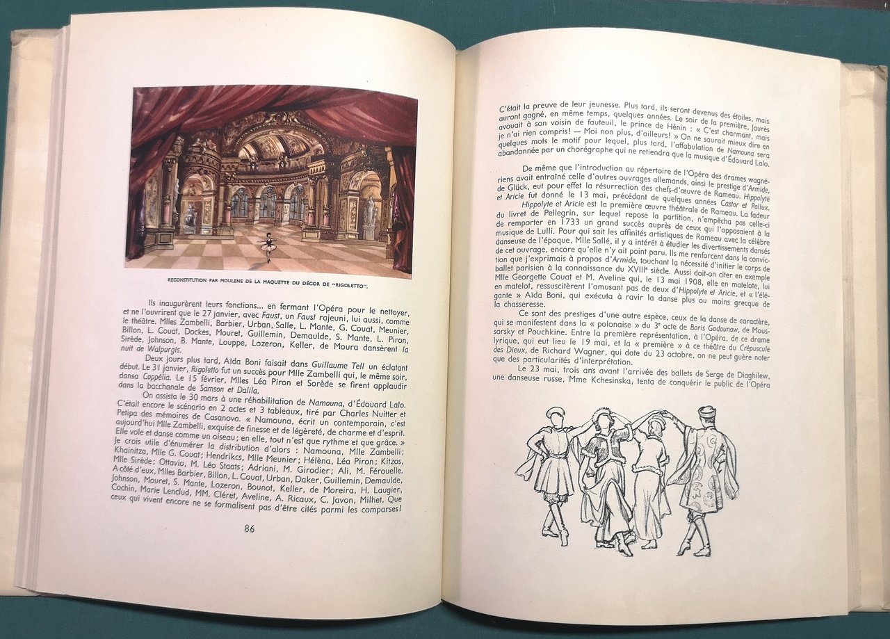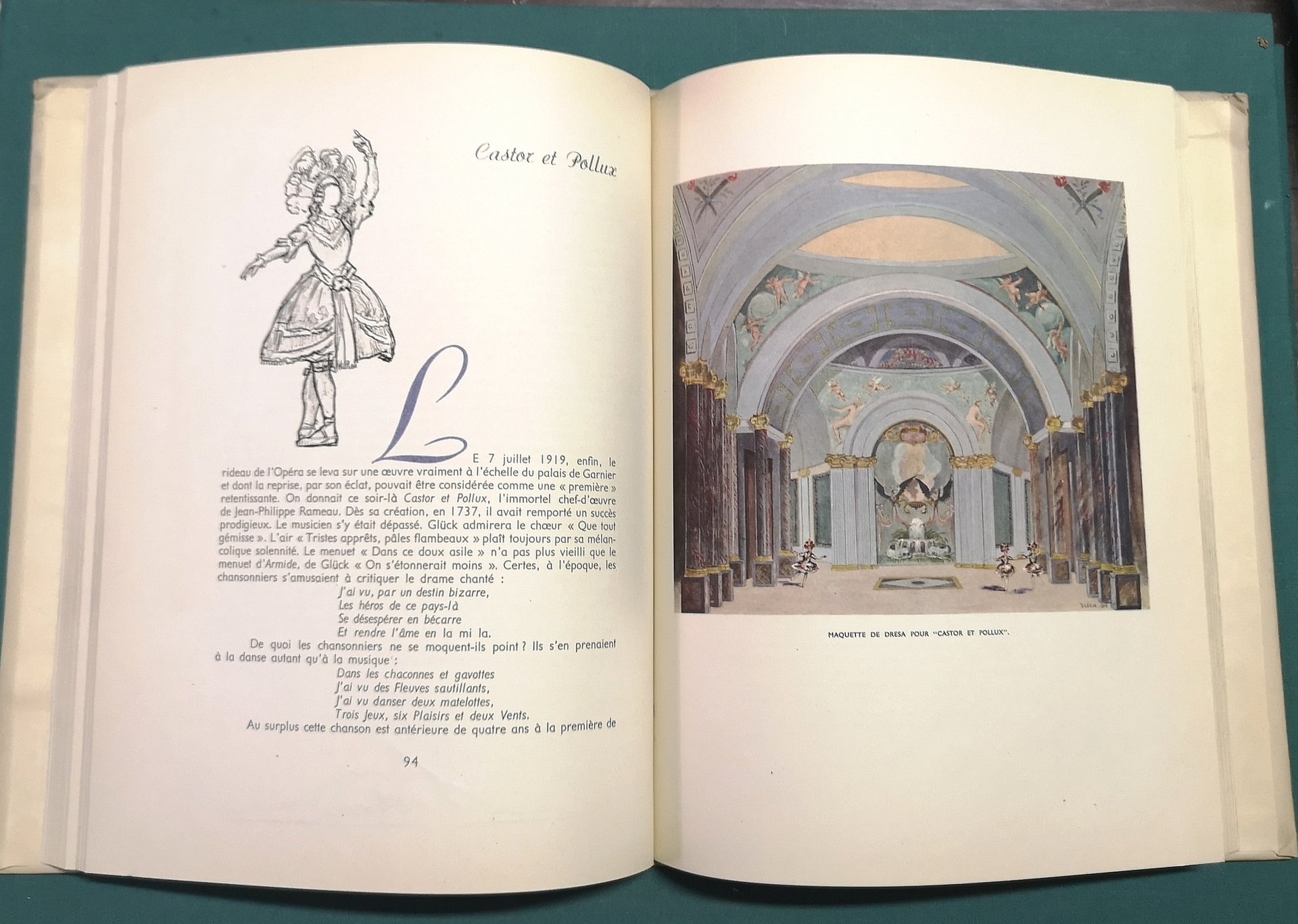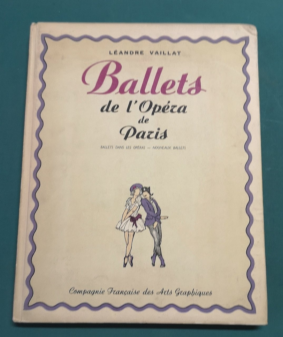 >in-4, pp. 183, (5) 15 tavole a p. pagina a colori raffiguranti costumi e scenografie, disegni di ballerine e figurini su quasi ogni pagina, litografie di Jean-Charles Duval. Cart. editoriale figurato a colori. Edizione originale, impressa in 5912 esemplari (n. 2292). Storico dell'architettura e critico del balletto per Le Temps, Vaillat traccia la storia dettagliata degli spettacoli dell'Opera di Paris. Perfetto esemplare.