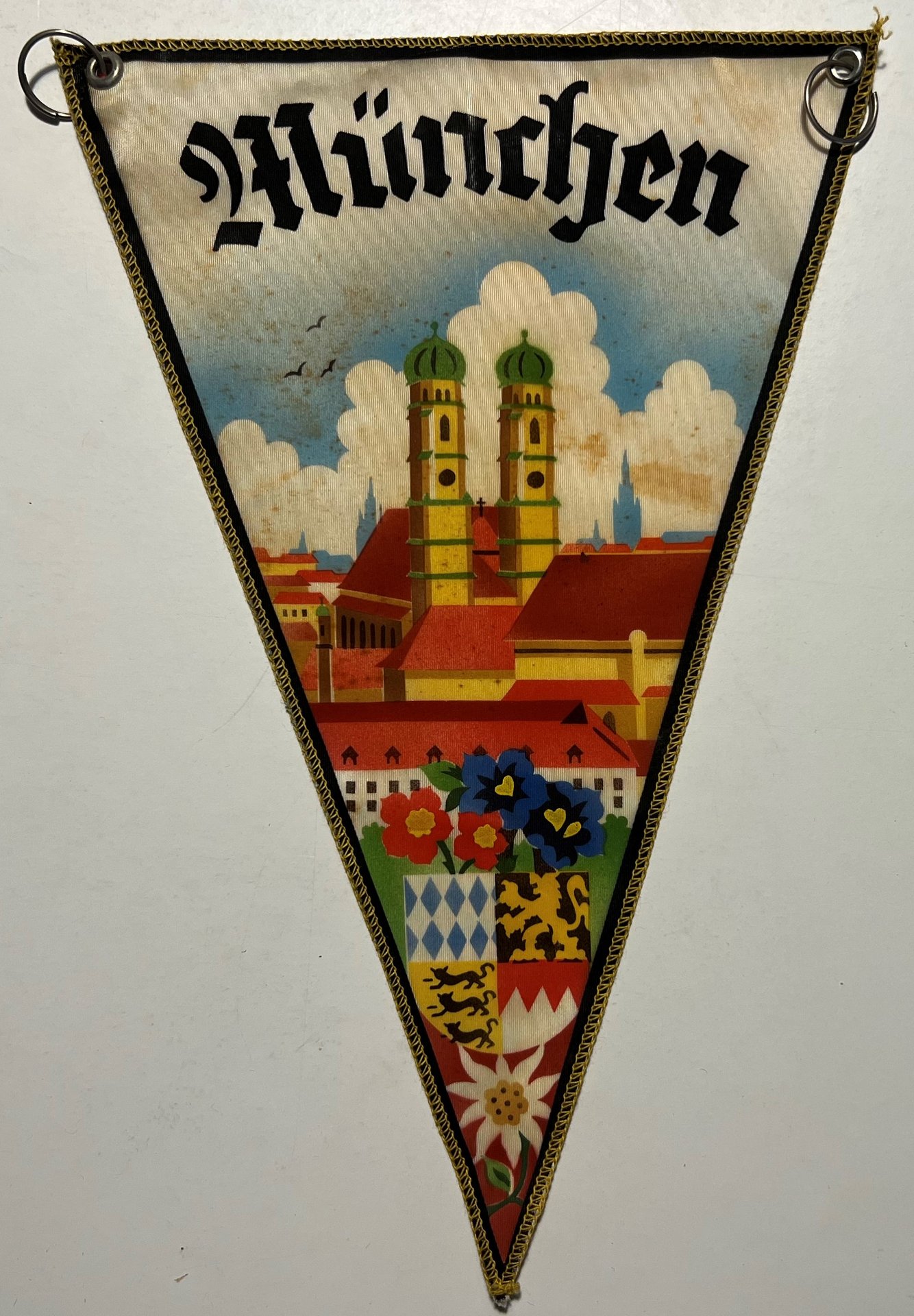 Bandierina Gagliardetto Moto Vespa - München - Anni '60 Dimensioni 25 x 16 cm Condizioni buone con piccoli segni del tempo.