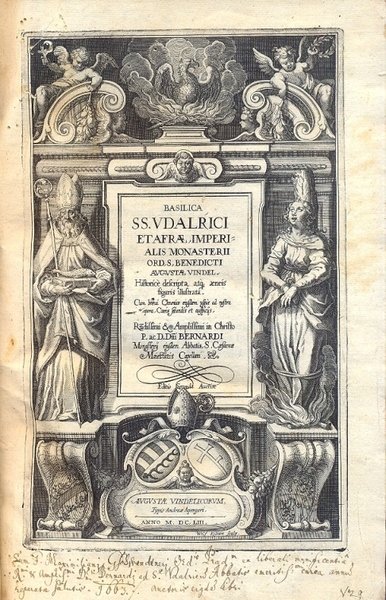 Basilica SS. Udalrici et Arae Imperialis Monasterii Ord. S. Benedicti Augustae Vindel. Historice descripta atq aeneis figuris illustrata. Cum brevi chronico eiusdem usquè ad nostra tempora, curis secundis et auspicys. Rndissimi & Amplissimi in Christo P. ac. D. Dni Bernardi Monastery èiusdem abbatis S. Caesarea Maiestatis Capellani.