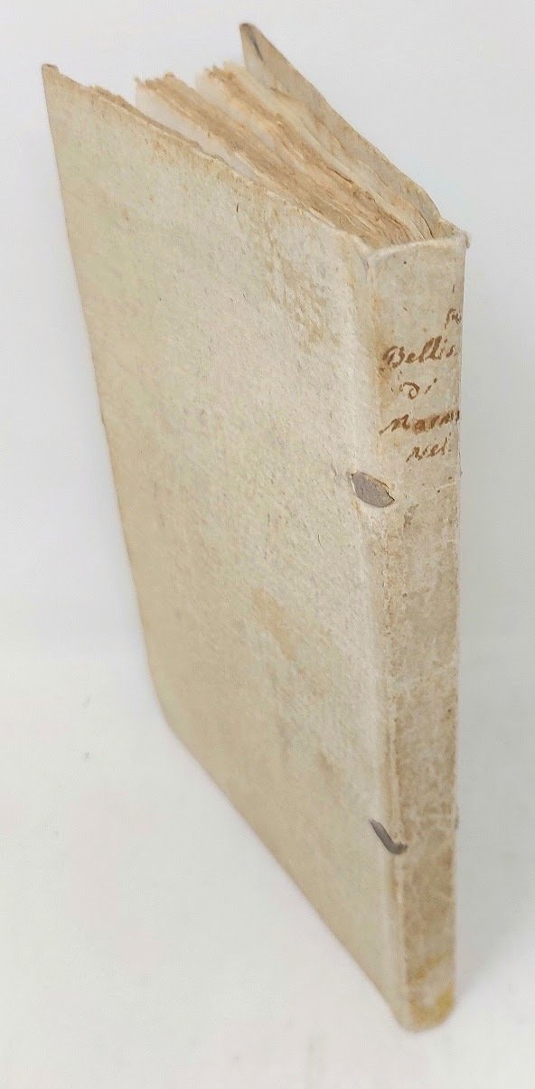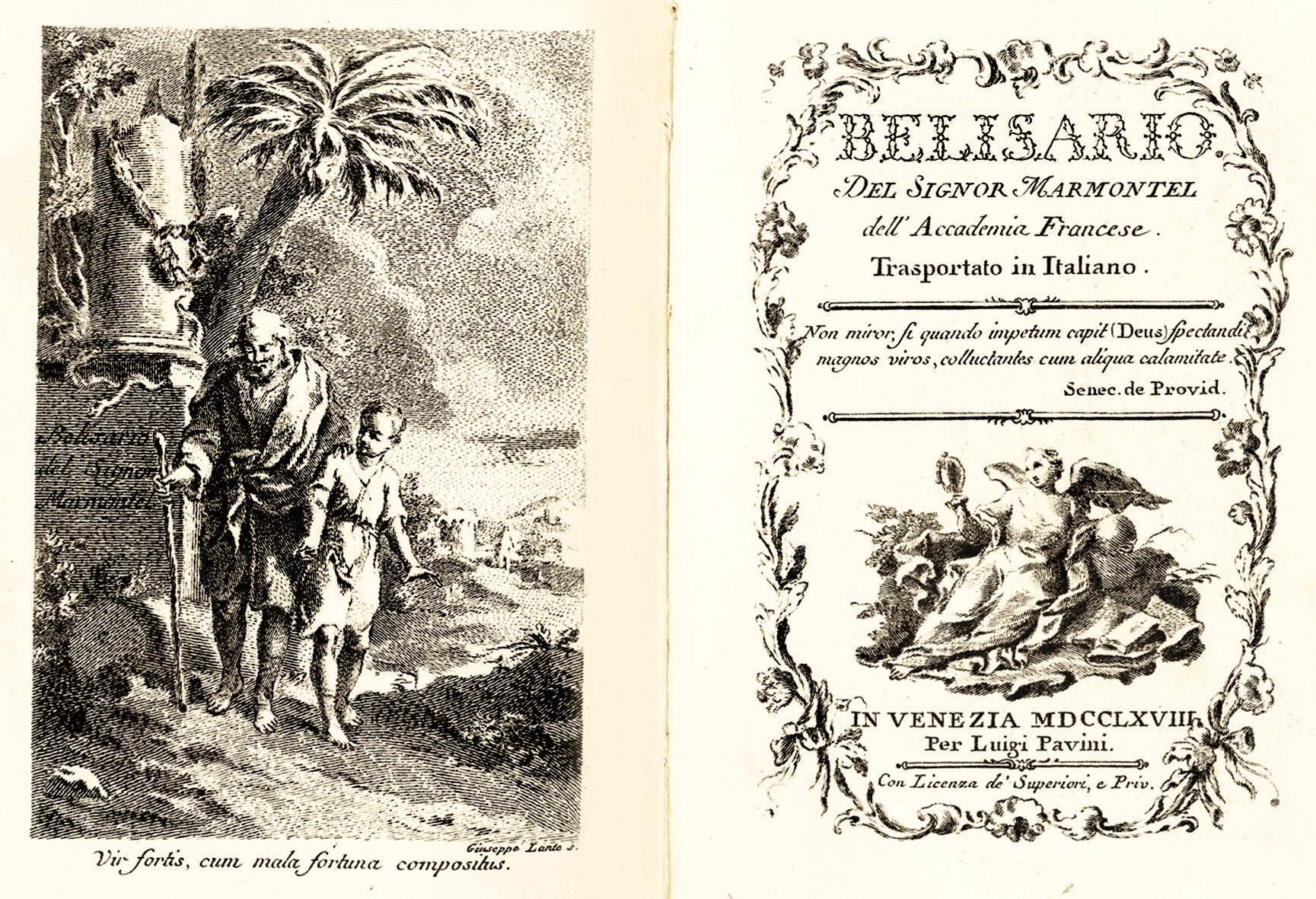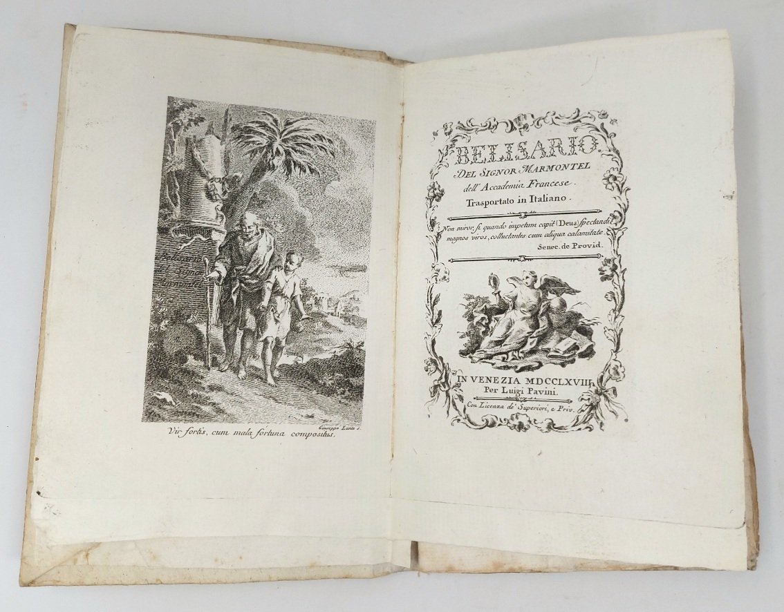 >in-8, pp. 158, (2 bianche), frontispizio con vignetta e antiporta calcografici, 3 tavole fuori testo incise da Giuseppe Lante. Cartonato rustico coevo, titolo ms. al frontespizio.. Dedica dell'editore a Caterina Dolfin Tiepolo. Prima edizione (contemporanea a quella di Milano, Agnelli) e prima traduzione italiana del romanzo storico Bélisaire (1767) che attira rapidamente le ire dei teologi della Sorbona e la censura dell'arcivescovo di Parigi; incriminato è in particolare il capitolo XV, in cui il protagonista propugna l'idea della tolleranza religiosa. Le condanne contribuiscono in realtà al successo dell'opera, subito difesa dai Philosophes e che, su consiglio di Voltaire, Marmontel invia a monarchi illuminati quali Federico II di Prussia e l'imperatrice Caterina di Russia, favorendone traduzioni e circolazione. Bell'esemplare, in barbe, minime fioriture. Graesse IV, p. 406 (che sbaglia nell'identificare come prima l'ed. di Venezia 1784).