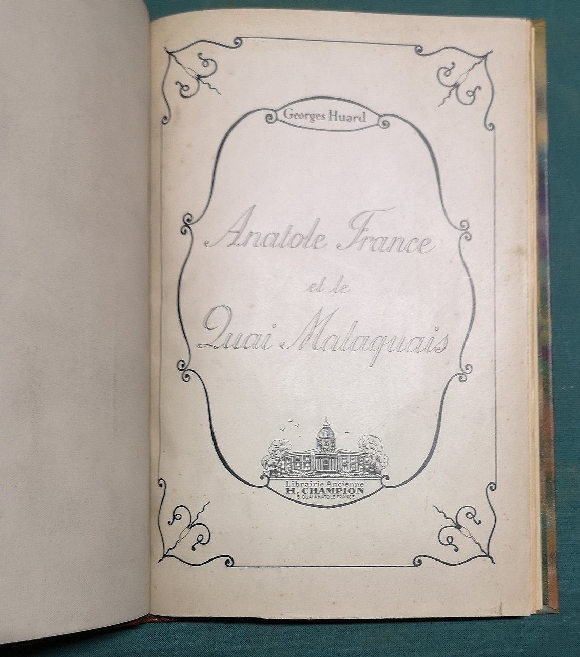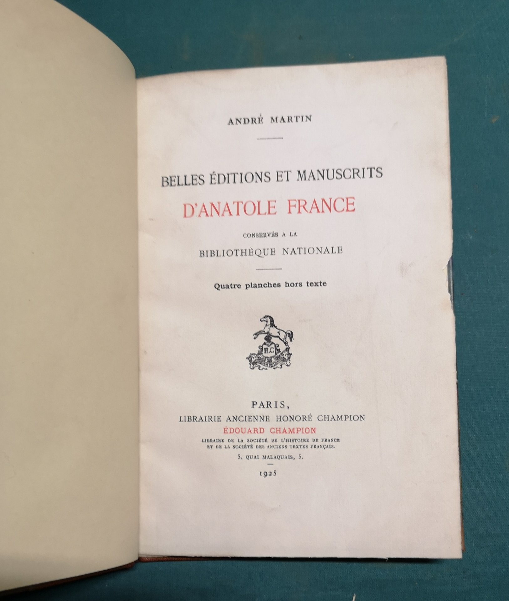 Belles éditions et manuscrits d'Anatole France conservés à la Bibliothèque nationale. Quatre planches hors texte. (Legato con:) Anatole France et le Quai Malaquais, illustré d'un dessin originale de M. Ch. Jouas.