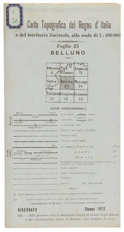BELLUNO. Foglio 23 della Carta Topografica del Regno d'Italia e del territorio limitrofo, alla scala di 1:100.000.