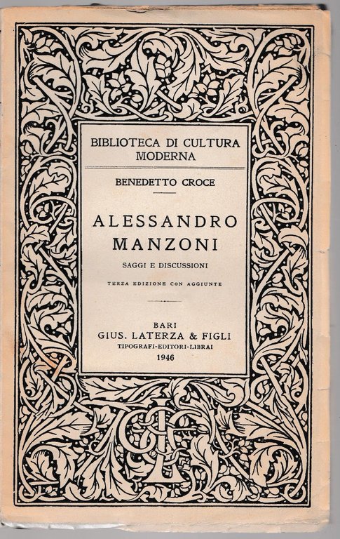 BIBLIOTECA DI CULTURA MODERNA BENEDETTO CROCE ALESSANDRO MANZONI SAGGI E DISCUSSIONI 3∞ EDIZIONE CON AGGIUNTE BARI GIUS. LATERZA E FIGLI 1946 L4306 COPERTINA MORBIDA EDITORIALE CON PICCOLI STRAPPI AL MARGINE ESTERNO DEL PIATTO ANTERIORE ANTERIORE, UNA LIEVE PIEGA ALL'ANGOLO SUPERIORE DESTRO SU QUASI TUTTE LE PAGINE, TAGLI BRUNITI, INTERNO IN BUONO STATO, LIEVE ALONE AL MARGINE ESTERNO DELLE PAGINE INTERNE N. PAG. 124 CM. 20,5 X 13