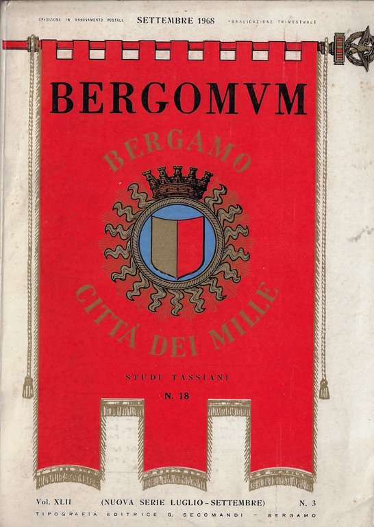a cura del Centro di Studi Tassiani; supplemento a: Bergomum, anno LXII, 1968; pubblicazione trimestrale; Molto buono (Very Good) leggeri segni del tempo sulla copertina, pagine in più che ottimo stato.