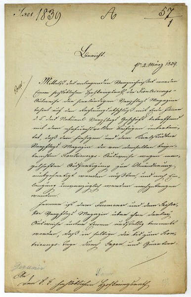 1½ SS. auf Doppelblatt. Folio. An den k.k. Hofkriegsrat: "Mittelst des anliegenden Verzeichnisses werden Einem hochlöblichen Hofkriegsrath die Scontrirungs-Ausweise der hierländigen Verpflegs Magazine basirt auf dem Rechnungsabschluß mit Ende Jänner d. J. das Natural Verpflegs Geschäft betreffend mit dem ehrfurchtsvollen Beifügen unterbreitet, daß dem hiesigen und dem Karlstädter Verpflegs Magazin die von demselben beigebrachten Scontirungs-Ausweise zur Umänderung rückgefertigt werden müßten [.]". - Geramb trat achtzehnjährig in das Husarenregiment Erzherzog Leopold Nr. 2 ein und durchlief eine steile militärische Laufbahn, die er, im Oktober 1840 als General in den Ruhestand tretend, beendete. "Im Gefechte bei Pordenone, in der Schlacht bei Fontana fredda, und bei der Behauptung der Stellung an der Piave (8. Mai 1809) gab er dem überlegenen Feinde gegenüber im entscheidenden Momente solche Beweise von Herzhaftigkeit und Umsicht, daß er durch das Ritterkreuz des Mar[ia] Theresienordens ausgezeichnet wurde" (Wurzbach V, s. v.). - Ohne das erwähnte Verzeichnis.
