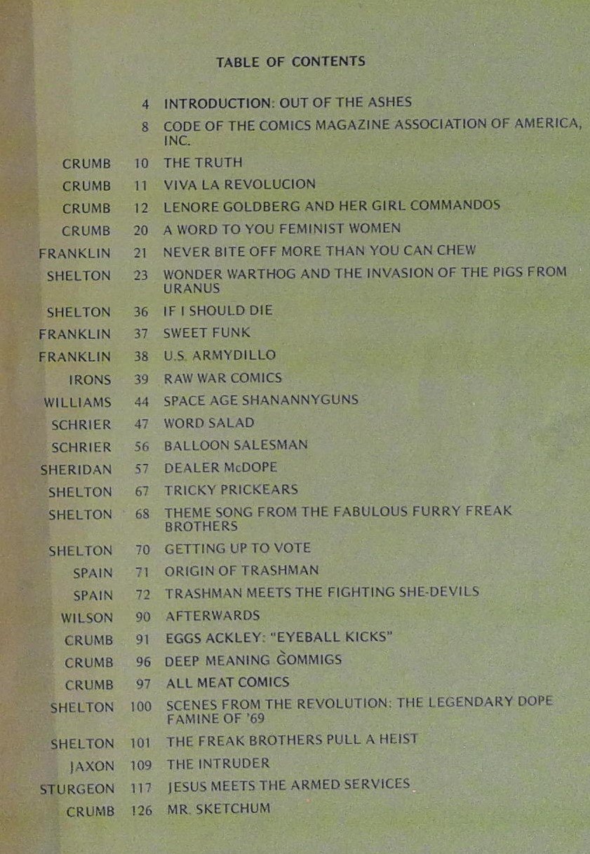 - Robert Crumb, Gilbert Shelton, Greg Irons, Dave Sheridan, Fred S, Chrier, Jack Jackson, Spain Rodriguez, Robert Williams, Foolbert, Sturgeon, Jim Franklin And S. Clay Wilson