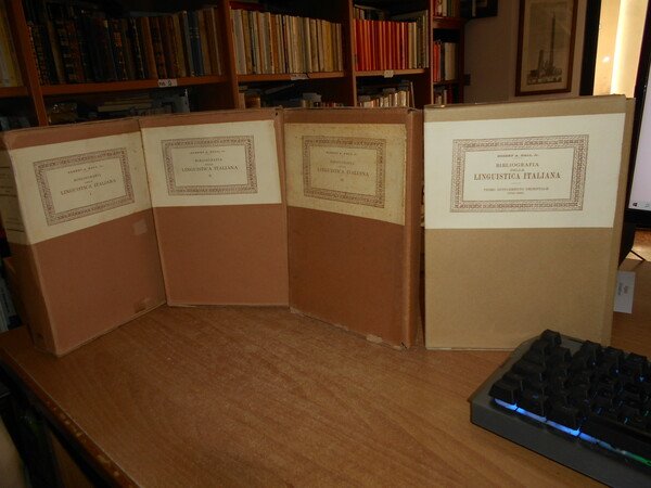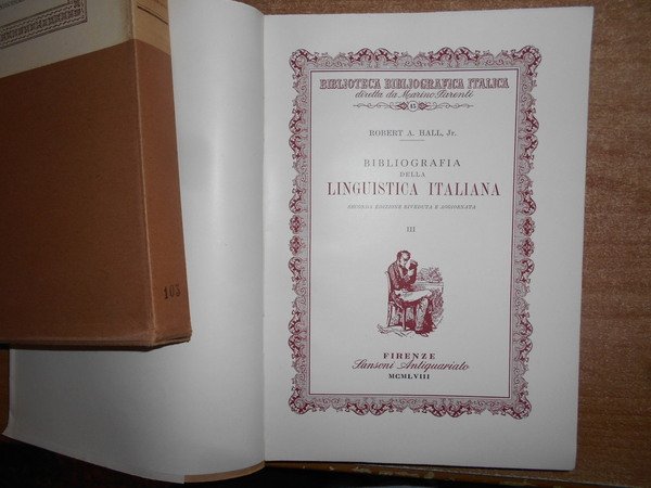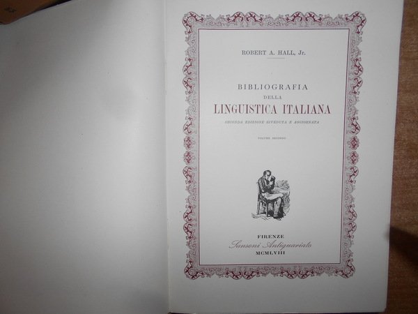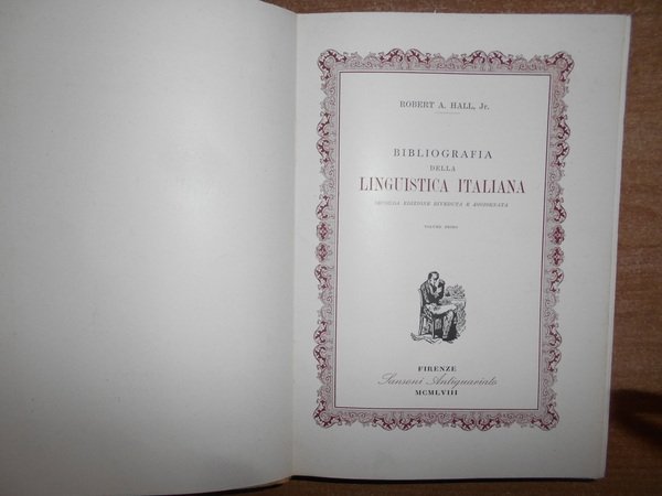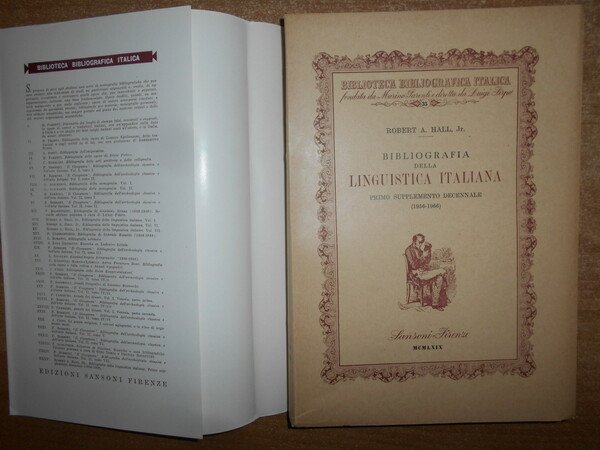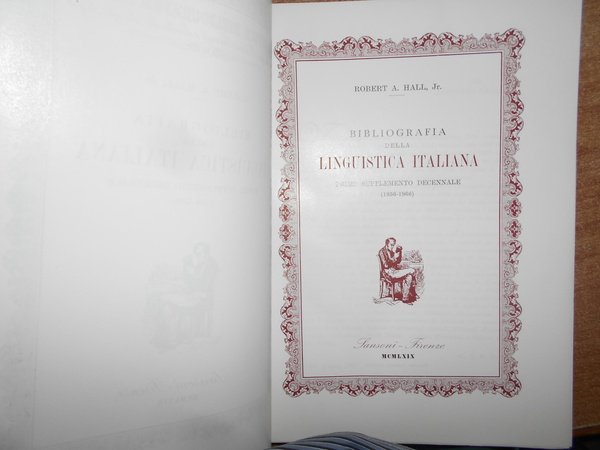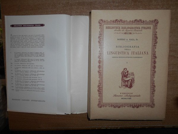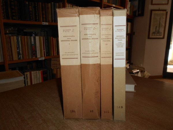 HALL ROBERT Jr. Firenze, Sansoni Antiquariato, 1958 - 1969. BIBLIOGRAFIA DELLA LINGUISTICA ITALIANA. SECONDA EDIZIONE RIVEDUTA E AGGIORNATA - PRIMO SUPPLEMENTO DECENNALE (1956 - 1966). 4 volumi in-8°, cart. edit. con le sovracopertine. 534, (10); 472, (8); 271, (3); 524, (4) pp. (n° 181 - 53 - 103), brossura editoriale con sovraccoperta (conservata la custodia del supplemento). Perfetto stato, intonsi. Seconda edizione riveduta e aggiornata, tirata a 666 copie (il "Supplemento" è in prima edizione e reca il n° 349). Biblioteca Bibliografica Italica, XXXV. Italiano. Uff. E - V - 5