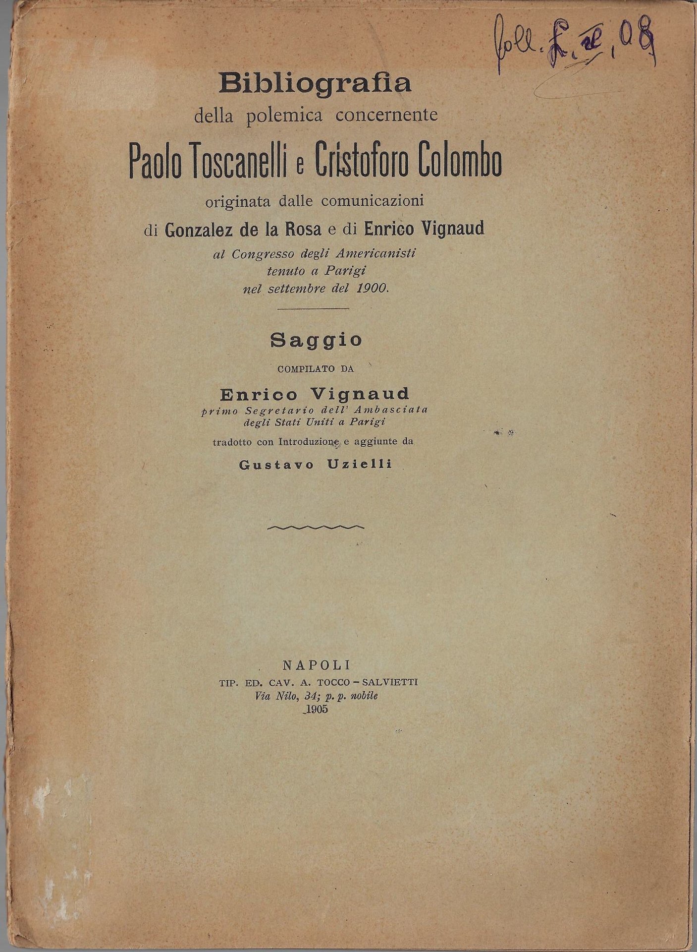 Bibliografia della polemica concernente Paolo Toscanelli e Cristoforo Colombo originata dalle comunicazioni di Gonzalez de la Rosa e di Enrico Vignaud al Congresso degli americanisti tenuto a Parigi nel settembre del 1900