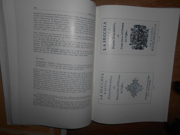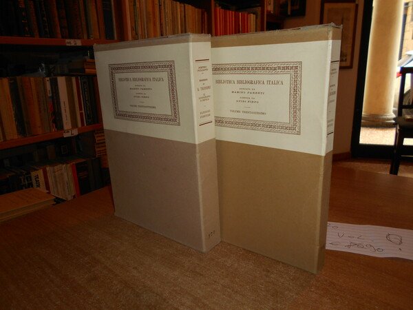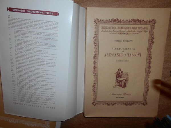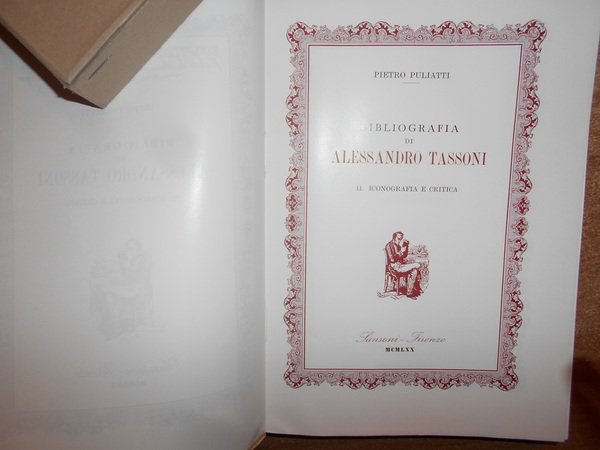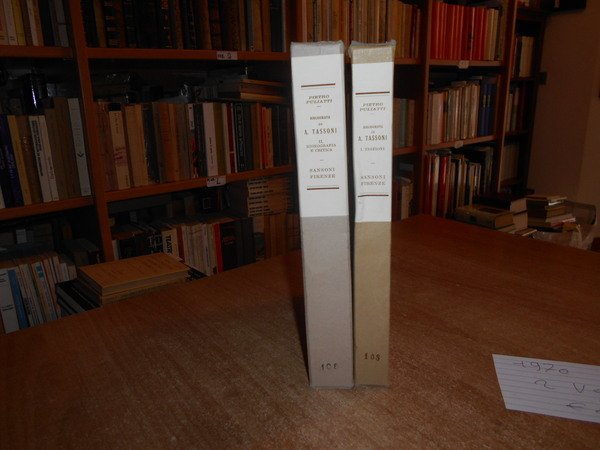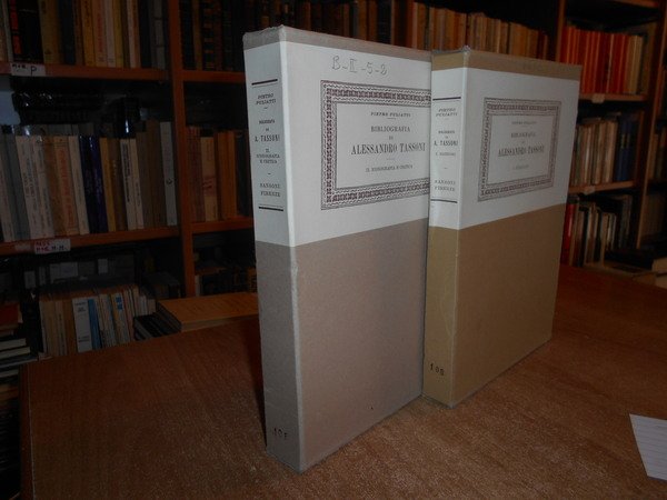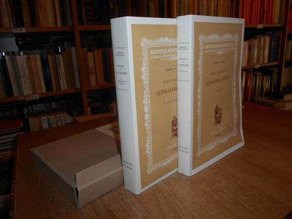 PIETRO PULIATTI. Firenze, Sansoni, 1970. BIBLIOGRAFIA DI ALESSANDRO TASSONI. Opera in due volumi; il primo raccoglie tutte le edizioni delle opere del Tassoni, con particolareggiate riproduzioni dei frontespizi e relative note bibliografiche. Il secondo, l'iconografia e la critica. Biblioteca Bibliografica Italiana fondata da Mario Parenti e diretta da Luigi Firpo. In-8° grande, cart. edit. con le sovracopertine. 496, (2) pp.; 709, (2) pp. con numerose riproduzioni di frontespizi. In ottimo stato di conservazione o come nuovi. Un volume a fogli chiusi. Inseriti negli astucci originali. Uff. B - II - 5 - 2