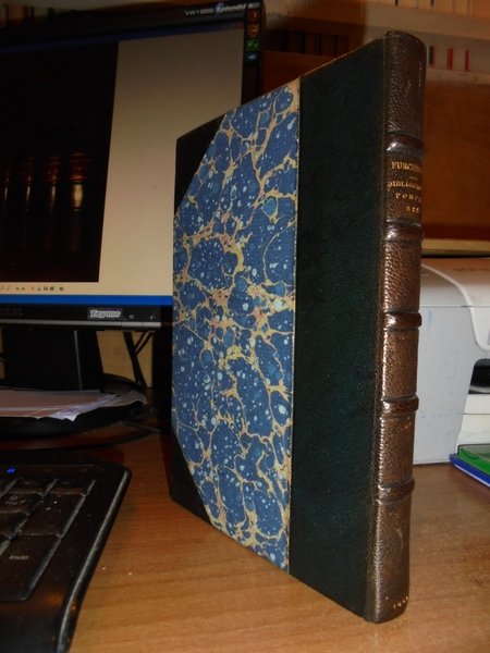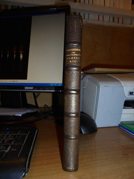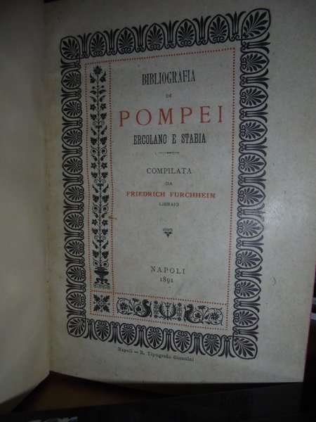 Friedrich, Furchheimm. Napoli, Friedrich, Furchheimm Editore, 1891. Bibliografia di POMPEI Ercolano e Stabia. Seconda edizione riveduta e notevolmente aumentata. In-16°, m. marocchino con angoli, dorso a nervi con titolo in oro, taglio rosso. xxxii, 119, (1 f. b.) pp. Copertine originali conservate. In ottimo stato di conservazione in legatura recente con le brossure originali conservate. E' presente una macchiolina nel margine bianco di 2 pagine. Uff. F - 6