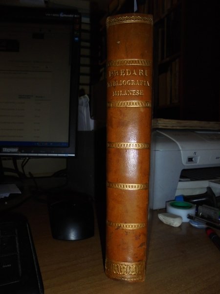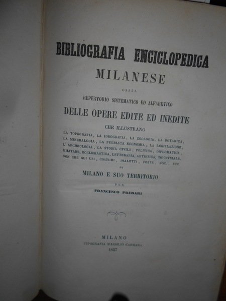 Francesco, Predari. Milano, Tipografia Marsilio Carrara, 1857. Bibliografia enciclopedica milanese ossia repertorio sistematico alfabetico delle opere edite ed inedite che illustrano la topografia, la idrografia, ecc., di Milano e suo territorio. Edizione originale. In-8°, m. pelle coeva, dorso decorato in oro. (viii), 695, (1) pp. Bell' esemplare esente da fioriture. Neg. mob. 4