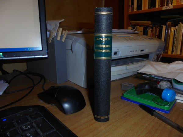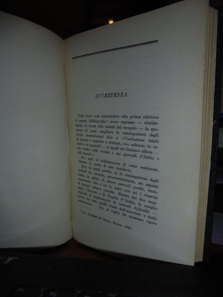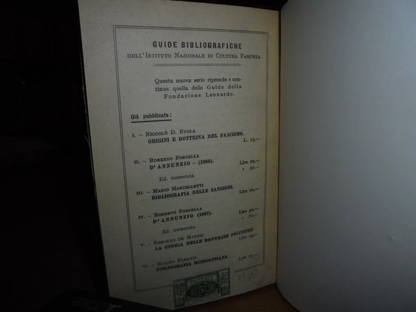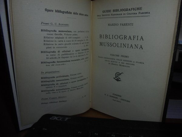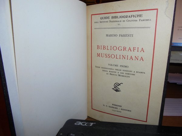 MARINO, PARENTI. Firenze, G.C. Sansoni, 1940. BIBLIOGRAFIA MUSSOLINIANA. primo vol. (ma unico); in 16°, tela bleu con fregi e titoloin oro al dorso, copertine originali conservate. xv, 283 pp. Serie cronologica delle edizioni a stampa degli scritti e dei discorsi di B. Mussolini. In ottimo stato di conservazione in legatura recente con le copertina originali conservate. (piccolo strappetto angolare in alto nella brossura anteriore). Uff. F - 4