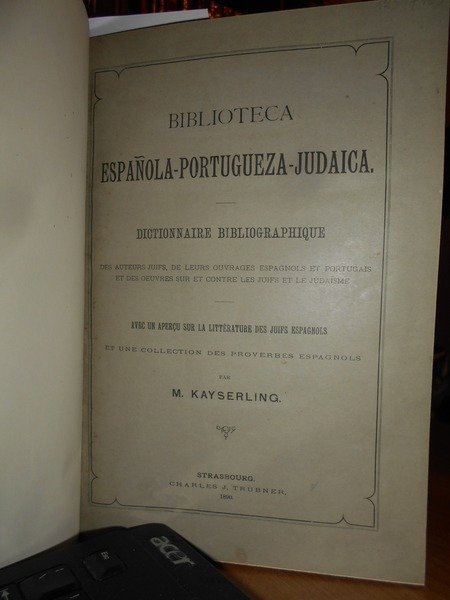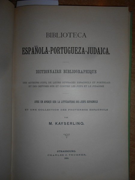 KAYSERLING, MEYER. Strasbourg, Charles J. Trubner, 1890. Biblioteca Española-portuguesa-Judaica. Dictionnaire Bibliographique des Auteurs Juifs, de leurs ouvrages espagnols et portugais et des oeuvres sur et contre les Juifs et le Judaisme. In-8°, tela con titolo in oro entro tassello al dorso, copertine originali conservate. xxi, 155 pp. con testo su due colonne. Perfetto esemplare della rara edizione originale. Neg. esot. mob. 72