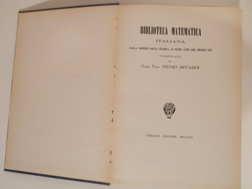 In-folio, cm 30, due volumi di pp.675 e 294, (54); tela editoriale azzurra con titoli in oro al dorso. Eccellente conservazione. Fondamentale bibliografia di opere matematiche italiane, pubblicata nel 1873 e ancora oggi utilissima.. *** TUTTI I NOSTRI LIBRI SONO VISIBILI PREVIO CONTATTO MAIL O TELEFONO NELLA NUOVA SEDE DI MILANO: LIBRERIA COSMOPOLIS, VIA JOMMELLI, 22. ***