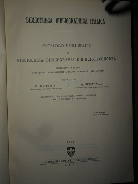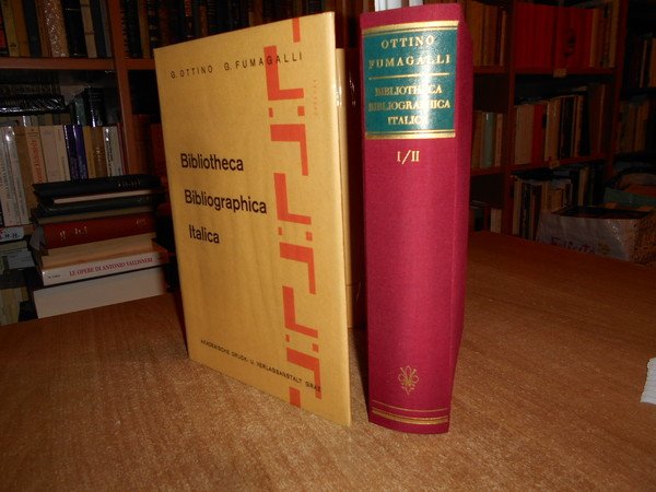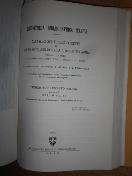 OTTINO, G. FUMAGALLI, G. Graz, Akademische Druck - U. Verlagsanstalt, 1957. BIBLIOTHECA BIBLIOGRAPHICA ITALICA I - II - 1,2,3,4 SUPPLEMENTO 1895-1896-1896/1899-1900. In-8°, tela rossa con titolo in oro al dorso, doppia sovracopertina. xxiv, 431 pp.; xxii, 242 pp.; 39 pp.; 136, (7) pp. Come nuovo. Uff. E - II - 4