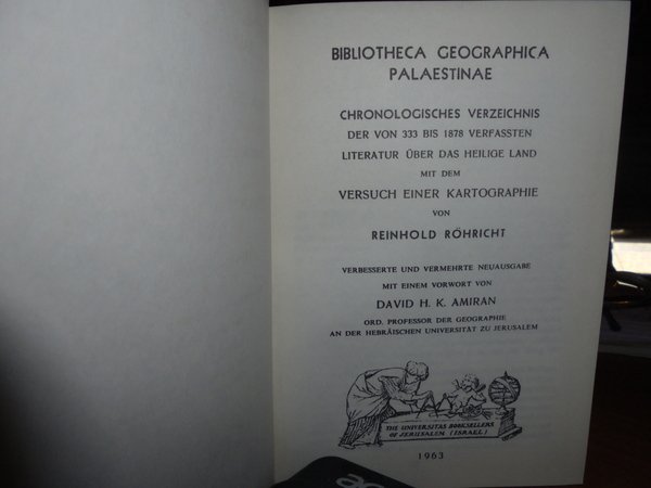 von Reinhold Röhricht 1842-1905. Jerusalem, The Universitas Bookseller of Jerusalem, 1963. Bibliotheca geographica Palaestinae : Chronologisches Verzeichnis der von 333 bis 1878 verfassten Literatur über das Heilige Land mit dem Versuch einer Kartographie. In-16°, tela edit. con titoli in oro. XVI, 816 pp. Ottimo esemplare. Uff. F - 2